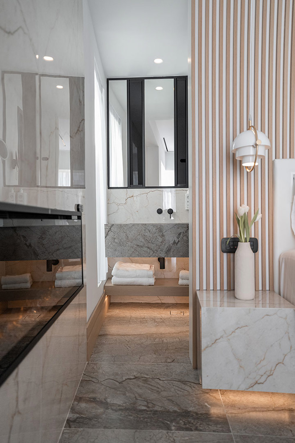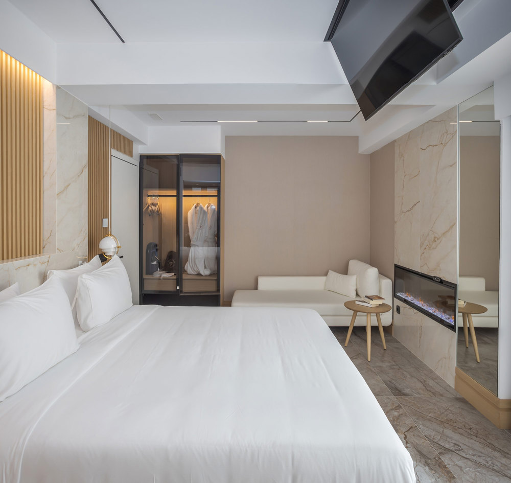 Our Luxury Suites with Plunge Pool offer over 50 square meters of luxurious living space. Located on the 4th floor, these suites feature a furnished balcony with a heated hot tub, plush seating, and a daybed, creating an exceptional outdoor living area. Enjoy breathtaking city views and unwind in the heated plunge pool, ensuring a serene and unforgettable stay.
